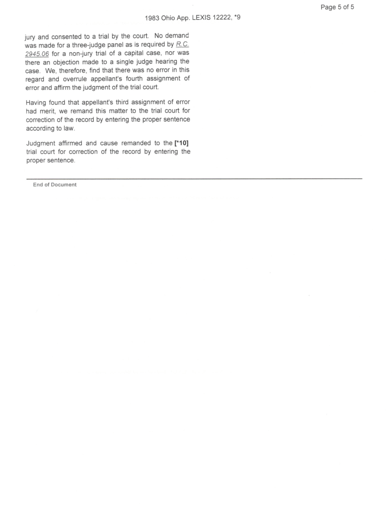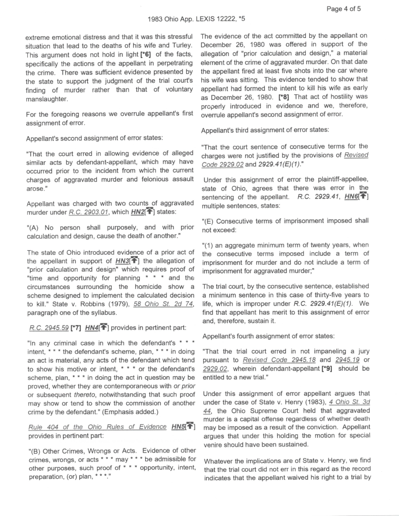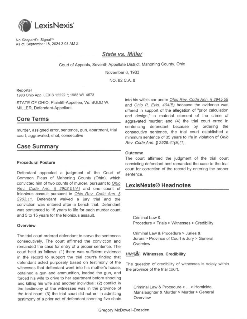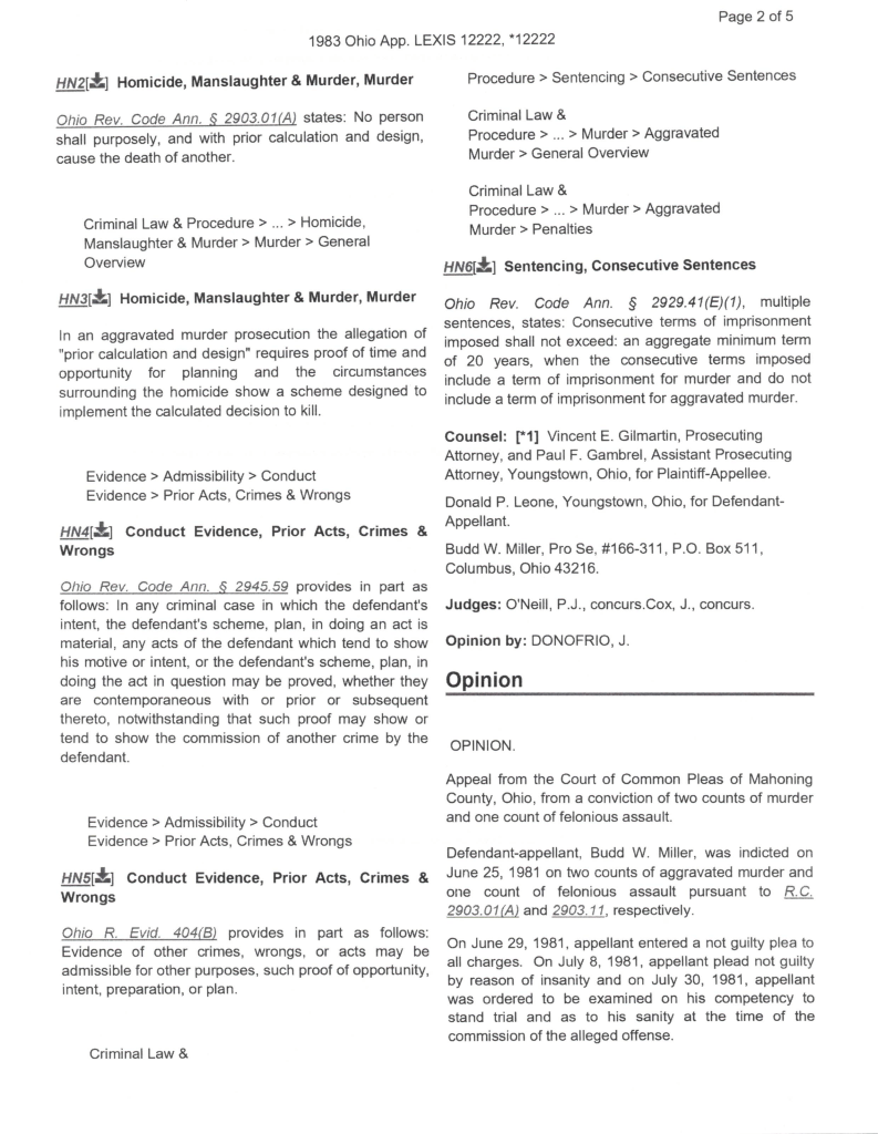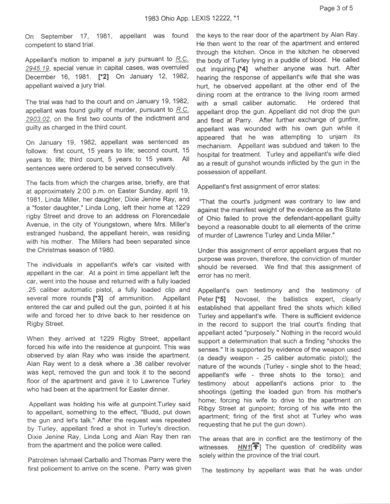 Budd Miller was convicted of two counts of murder for killing Linda Miller and Lawrence Turley and one count of felonious assault for shooting at Officer Perry. He was sentenced to two consecutive (back to back) life sentences for the murders plus five-15 years for shooting at Officer Perry. In 1983 The Seventh Appellate Distict Court of Appeals ruled that under current law Budd Miller could not receive consecutive life sentences and ruled that the sentences should be served concurrently (at the same time).